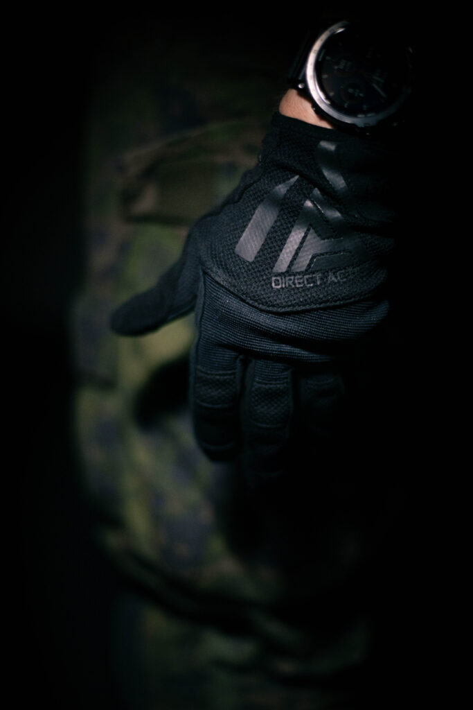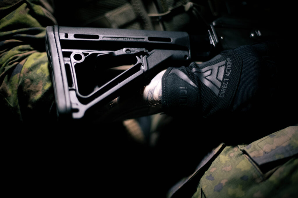 - Aseenkäsittelyyn ja välinekäyttöön: Pitkän aseen kanssa hyvä, ei juuri eroa paljaaseen käteen. Pistoolin kanssa (esim. Glock) liipasinsormen paksumpi materiaali voi rajoittaa tuntumaa.